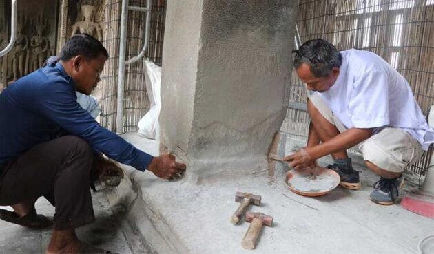 石材保存の専門家ソイ・ソペアリン氏によれば、劣化の原因は自然の風化とコウモリの尿によるものだという。これまでに10本中9本の修復が完了し、作業は約80%に達している。