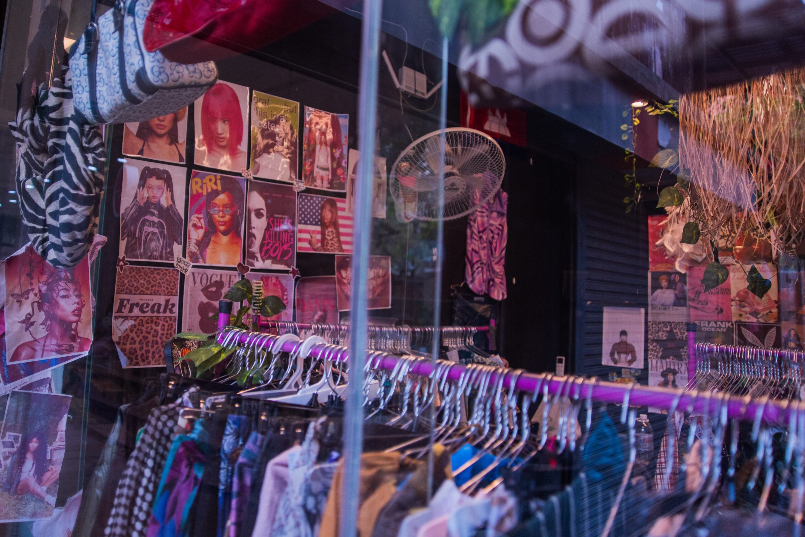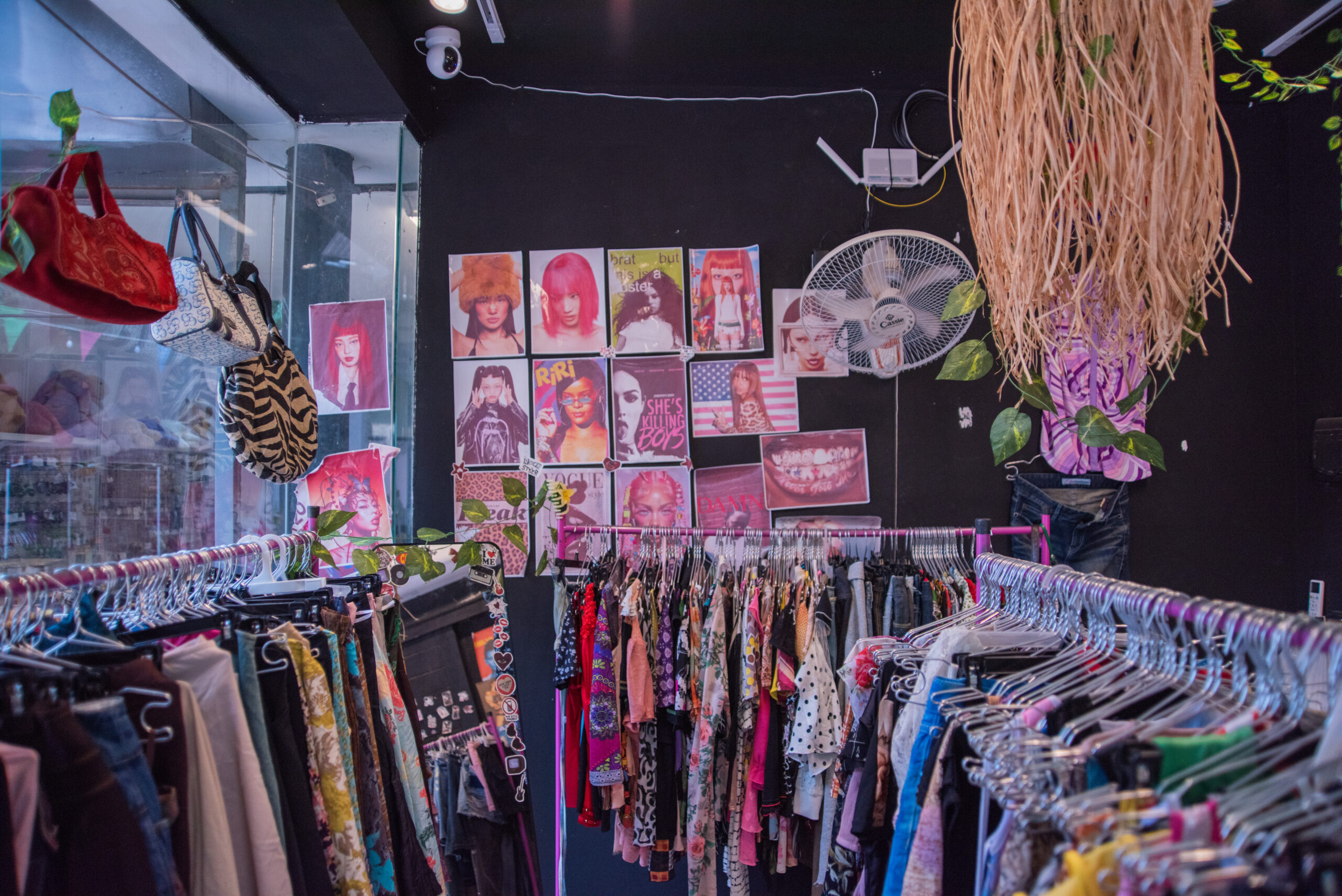 壁にはKendrick Lamarの「DAMN」のジャケ写やファッション誌「VOGUE」のポスターなどが無数に貼られている。さらに、ラックが全てピンクで統一されており、空間作りへの強いこだわりが感じられる。