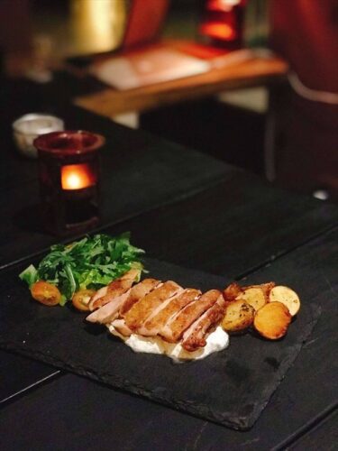 炭火で香ばしく焼いた鶏もも肉にザジキソース(ギリシャ風ヨーグルトソース)を付けて食べるヘルシーな料理です。また、添え物のポテトが実は好評で、お酒のおつまみにとても相性が良いです。