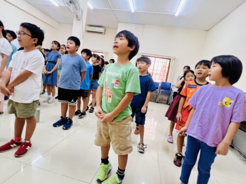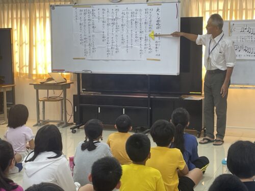 プノンペン補習授業校の小中学部の朝は、児童生徒全員が多目的室に集まり、歌を歌うことから始まります。学校の最初の活動として大きな声を出して歌うことは、心も体もしゃんと目覚め、授業に取り組む前のよいウォーミングアップになります。