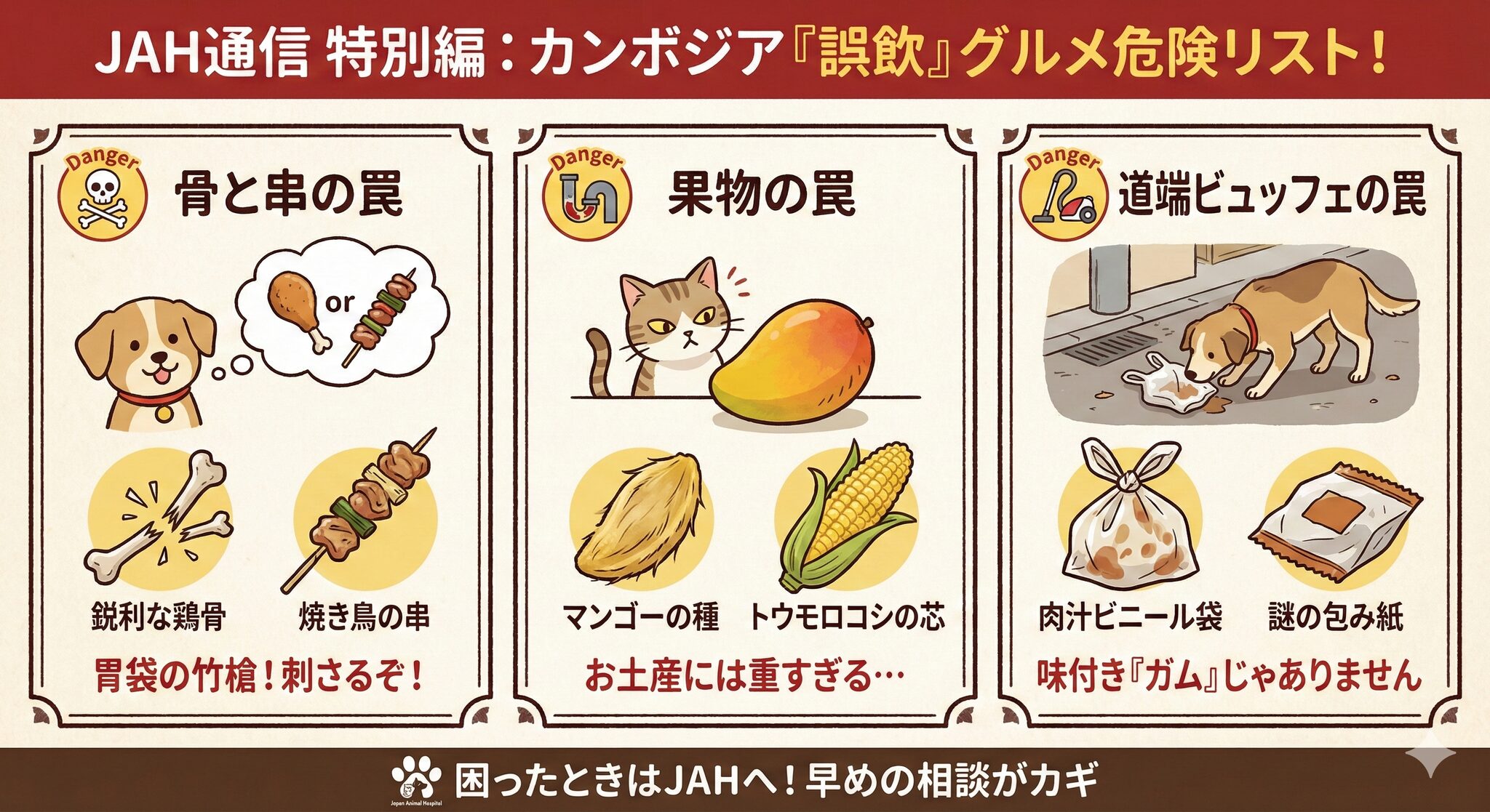 散歩道も油断禁物、そこは巨大な「ビュッフェ会場」です。ポイ捨てされた肉汁付きのビニール袋や焼き鳥の串、そして今の時期ならマンゴーの種。これらは消化されず、腸に詰まると手術コース直行便です。「あ、ダメ!」と叫んだ瞬間、掃除機のような吸引力で証拠隠滅(飲み込み)されたら……飼い主さんは冷や汗ものでしょう。