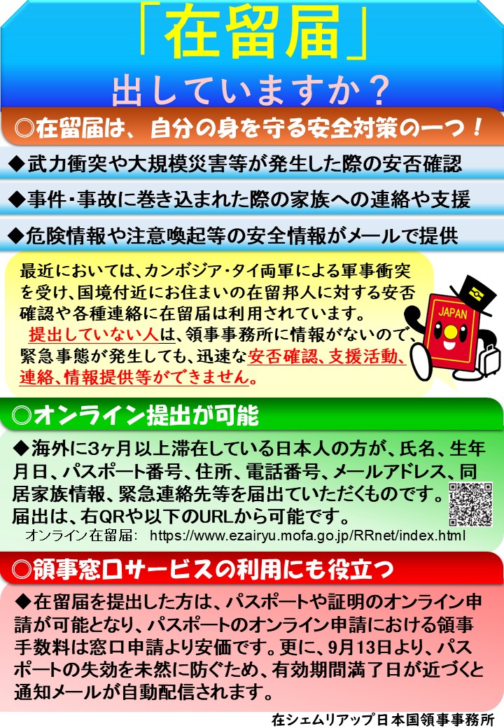 海外在住においては、様々なリスクを認識の上、各人が「自分の身は自分で守る」心構えで、危機管理意識を高くして、備えていただくことが大切です。最近では、カンボジア・タイ両軍による軍事衝突を受け、国境付近にお住まいの方の安否確認や各種連絡に在留届は利用されました。未提出の方については、こちらに情報がないので、迅速な安否確認や支援活動等ができません。以下のURLやQRコードからオンラインで届出をお願いします。