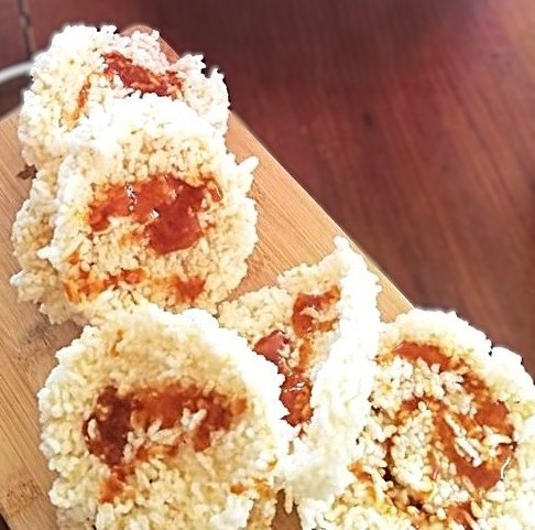 最近は、カンボジアの伝統お菓子として甘いソースや、牛肉のフレークがかかったものがスーパーに売っていることも。
