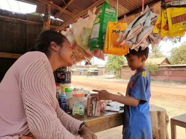 彼女の思いを受け、スロラニュプロジェクトから開店資金の100$を貸付け、時間がかかっても良いので少しずつ返済する事を約束しました。彼女は自分で業者と連絡を取り合い、商品を仕入れ、ご兄弟の協力で店のレイアウト等を整え、約1週間でお店をオープンする事が出来ました。村の子ども達向けのおやつや飲み物、普段使いの日用品等を販売する小さなお店ですが、1日のお店番が彼女の生活の中心となりました。