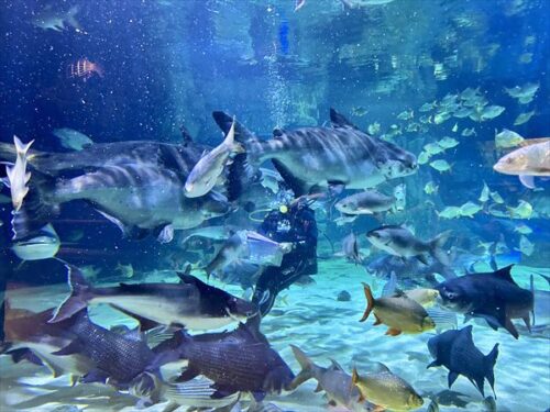 施設の展示内容もとても充実しており、東南アジアの淡水魚を中心に、多彩な生きものたちの世界を楽しめます。特に巨大水槽の中を悠然と泳ぐメコンオオナマズの姿は迫力満点!水族館エリアは屋内施設なので、天候を気にせず足を運べるのも嬉しいポイントです。