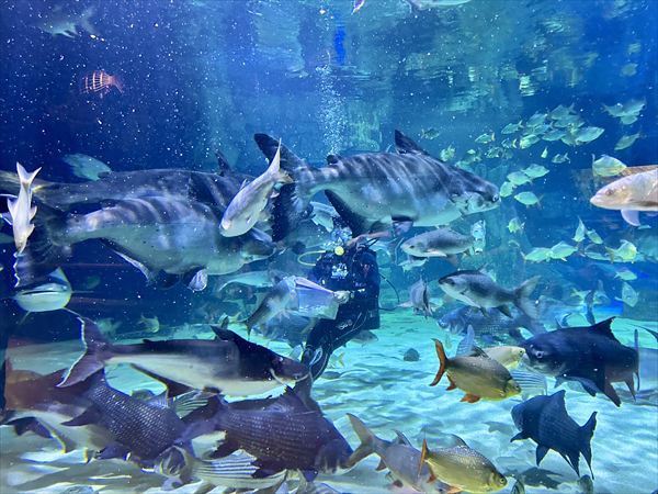 施設の展示内容もとても充実しており、東南アジアの淡水魚を中心に、多彩な生きものたちの世界を楽しめます。特に巨大水槽の中を悠然と泳ぐメコンオオナマズの姿は迫力満点!水族館エリアは屋内施設なので、天候を気にせず足を運べるのも嬉しいポイントです。