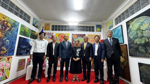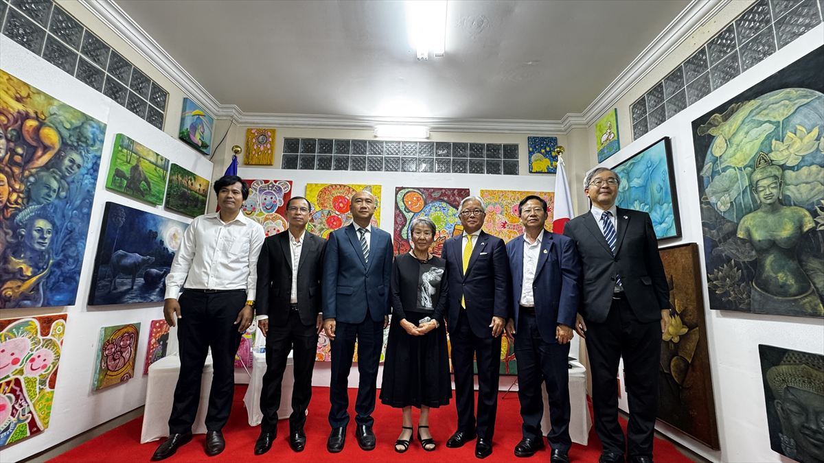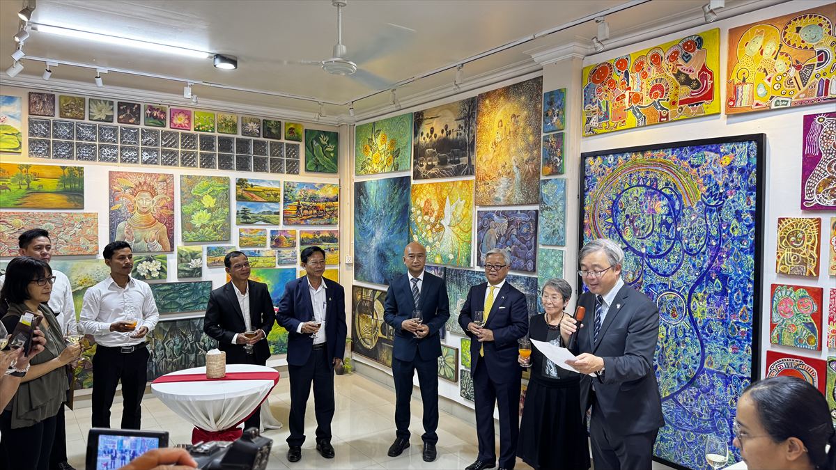 2025年12月11日、シェムリアップにおいて笠原知子・小さな美術スクール創立者に対する令和7年度外務大臣表彰レセプションを開催しました。本表彰レセプションは、植野大使主催の下、カンボジアの子どもたちが描いた作品が数多く展示されている小さな美術スクールにて行い、ユン・リンネ州副知事、リー・ブンナ州教育局長、メー・ソンボー州文化局次長に加え、これまでスクールを支えてきた多くの方々にご参加いただきました。