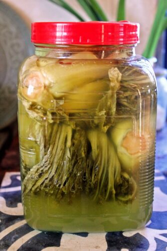 3、瓶の中に高菜を丸めるようにいれ、塩水がさめたらそそぎいれる。