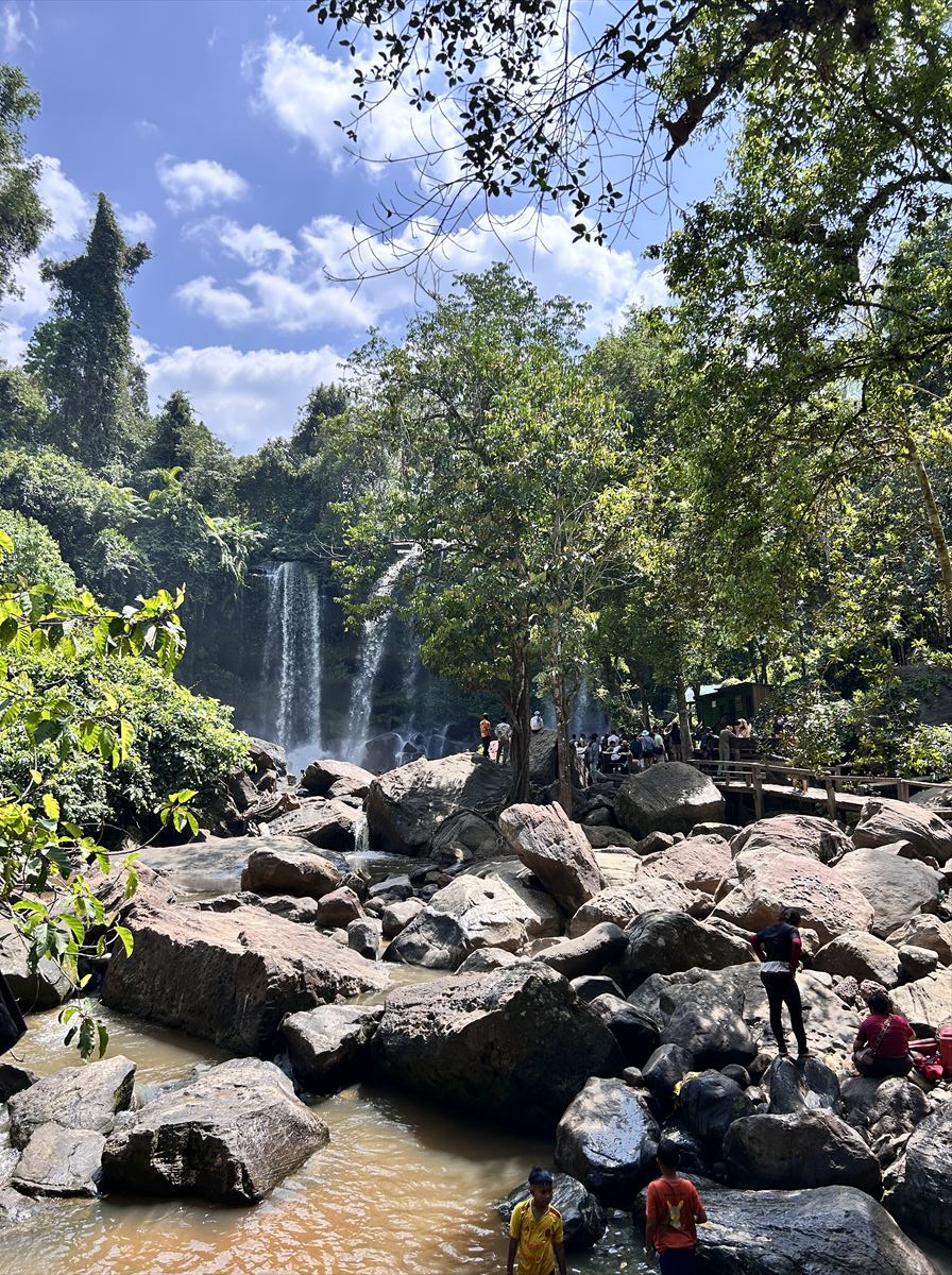 プノン・クーレン最大の見どころは、なんといっても壮大な滝。岩肌を流れ落ちる水は迫力があり、近くまで行くと水しぶきと涼しさが心地よく感じられます。納涼スポットとしても人気があり、前回訪れたときも水辺で涼みながら楽しむ多くの人で賑わっていました。暑いカンボジアでは、まさに天然のリフレッシュスポットです。