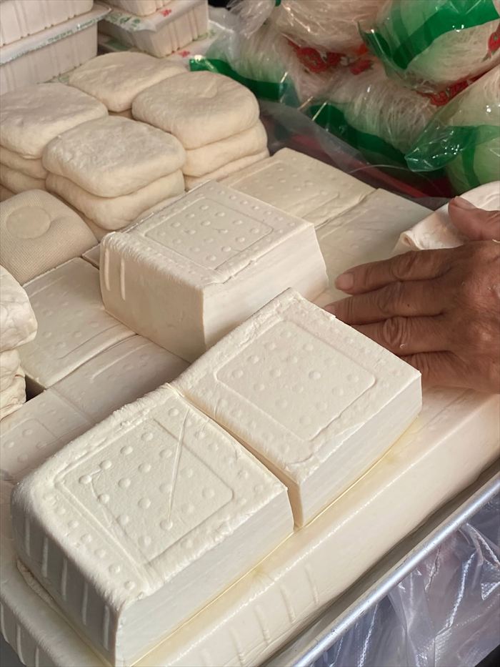 メインの豆腐ですが、日本の島豆腐のような硬さがあり、市場では水の中ではなく常温で積み重ねて売られています。作り方は、浸水させた生大豆をすり潰し豆乳を作り、それに火を入れて固めて行きます。日本は熱々の呉汁を絞り豆乳とするのですが、同じ豆腐でも所違えばです。