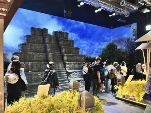 先日、大阪・関西万博のカンボジアパビリオンに行ってきました!館内でひときわ目を引いたのが、壁一面に展示された巨大なピラミッド型遺跡の模型。「こ